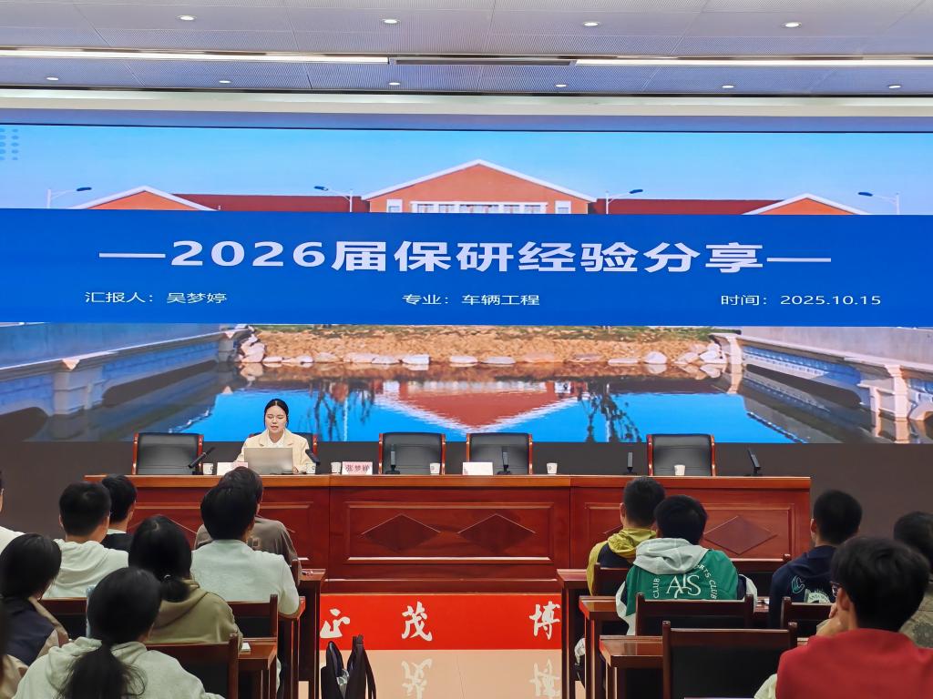 为帮助同学们深入了解研究生推免政策、明确未来发展方向,10月15日下午,学院在念艰楼3楼报告厅举办推免学子经验分享会。活动邀请机电工程学院2022级车辆工程专业2班罗伟、吴梦婷两位优秀学子及其辅导员张梦娣老师担任分享嘉宾。讲座吸引了学院200余名学生踊跃参与,学院党委副书记李连城主持会议,副院长熊珍凯及团委负责人等参加会议。