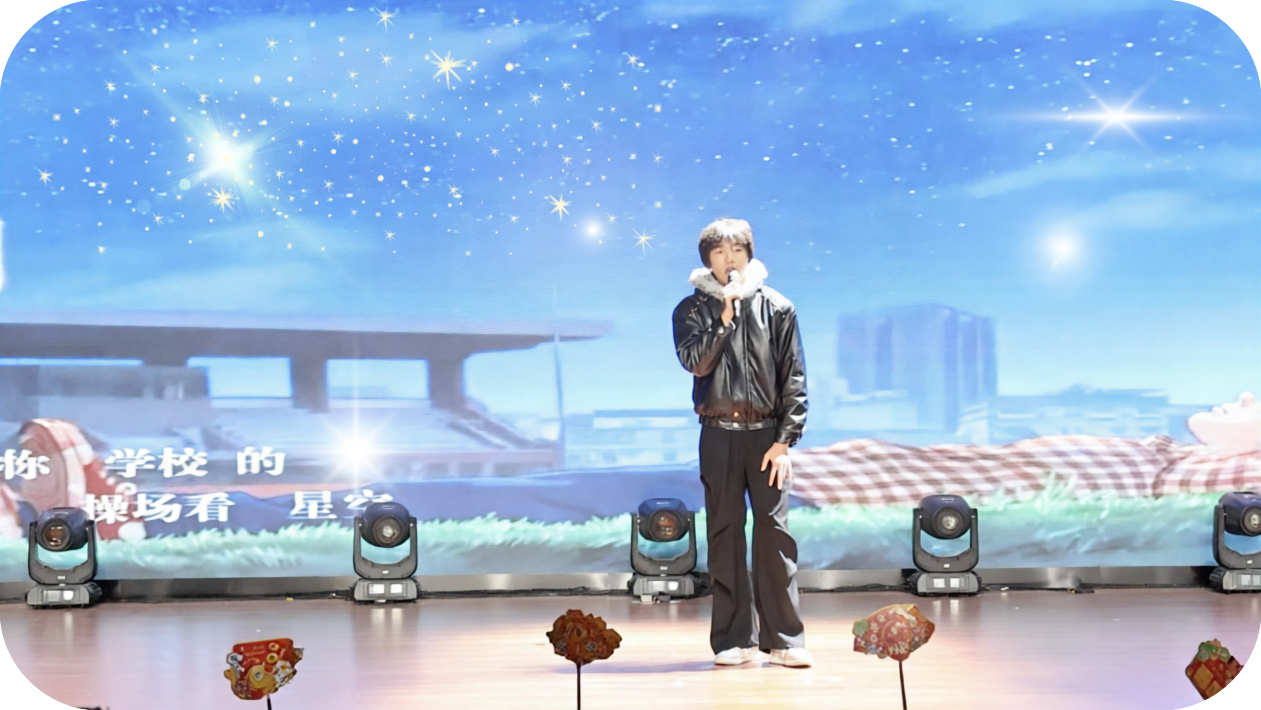 艺术之美,在于多元共鸣。王悦同学带来钢琴独奏《恋人》,琴音如珠落玉盘,音符清澈婉转,流淌着古典音乐的优雅与深情。高嫣然与董倍慧同学联袂呈现一段精心编排的舞蹈串烧。节目巧妙融合多种现代舞元素,创意十足,将全场气氛推向新的高潮。随后,冯丹阳同学演唱歌曲《Love Story》,用清新愉悦旋律,演绎青春年华的浪漫叙事。
