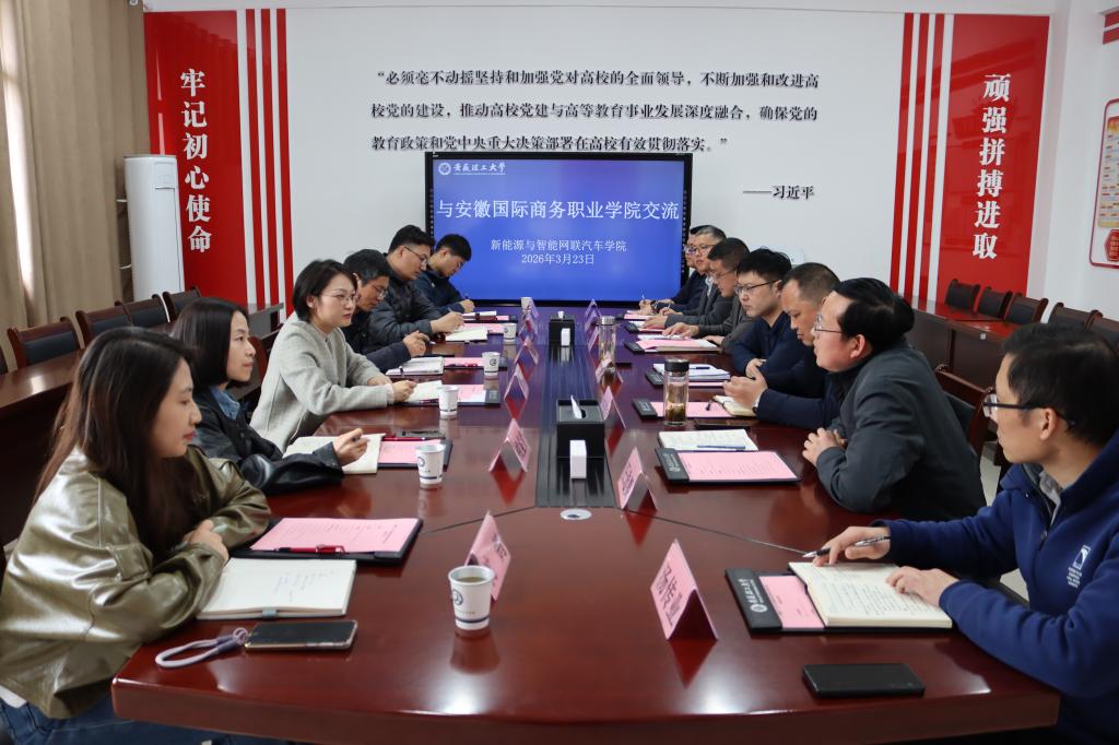 3月23日下午,安徽国际商务职业学院党委委员、纪委书记张翌,智慧交通学院院长朱超才、智慧交通学院党总支副书记钱鉴青、副院长赵鹏等一行来学院调研。双方围绕新能源汽车专业建设、学生管理与实验室建设等内容进行了深入交流。学院党委书记程刚主持会议,学院领导班子成员、系部负责人等出席会议。