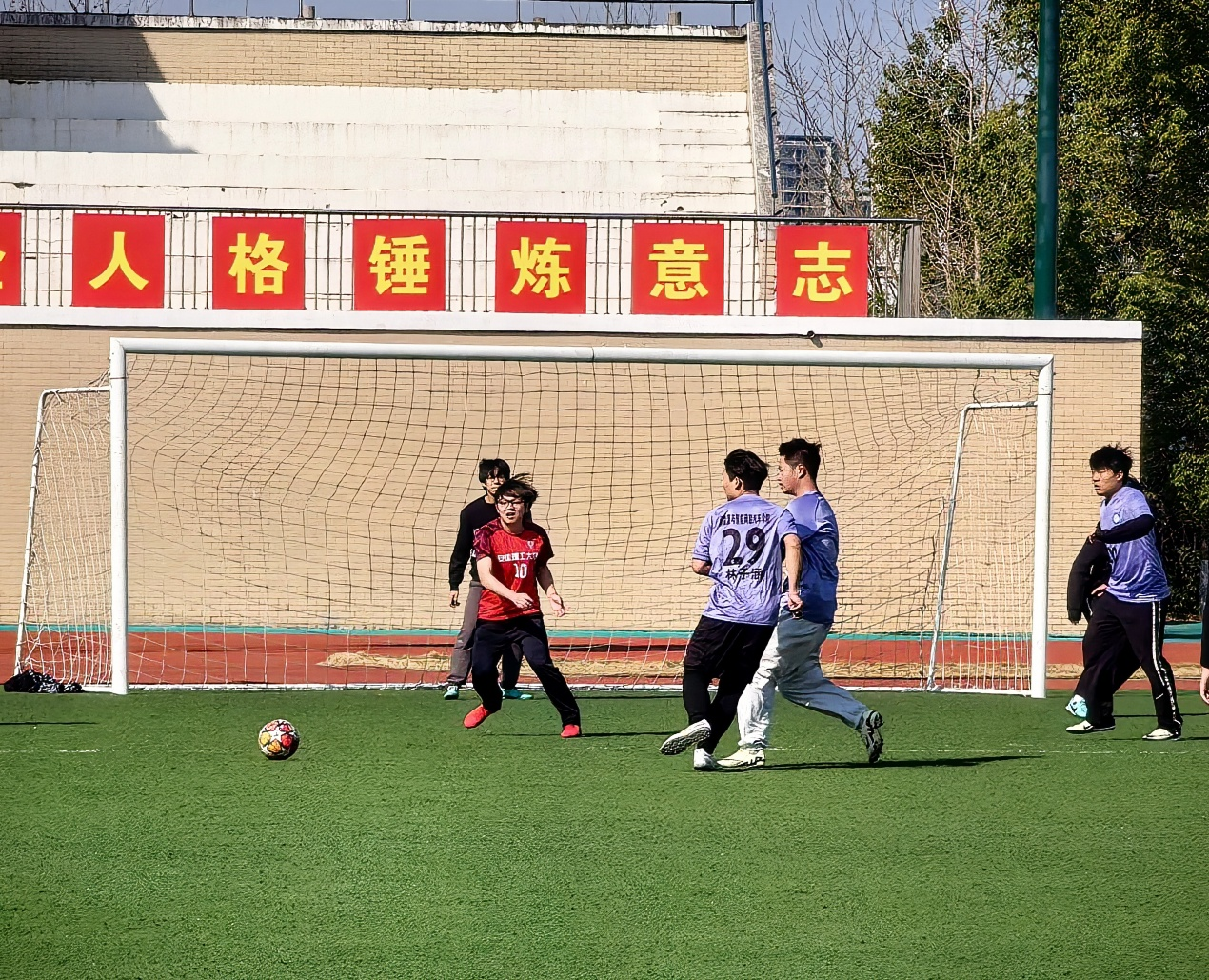 短暂休息后,我院球员在下半场迎来与人工智能学院的精彩对决。开场后,人工智能学院球员迅速发起猛烈进攻,但我院球员防守稳固,多次化解危机。双方球员在球场上奔跑如飞,进攻、防守、传球、射门,每个动作都充满力量与激情。