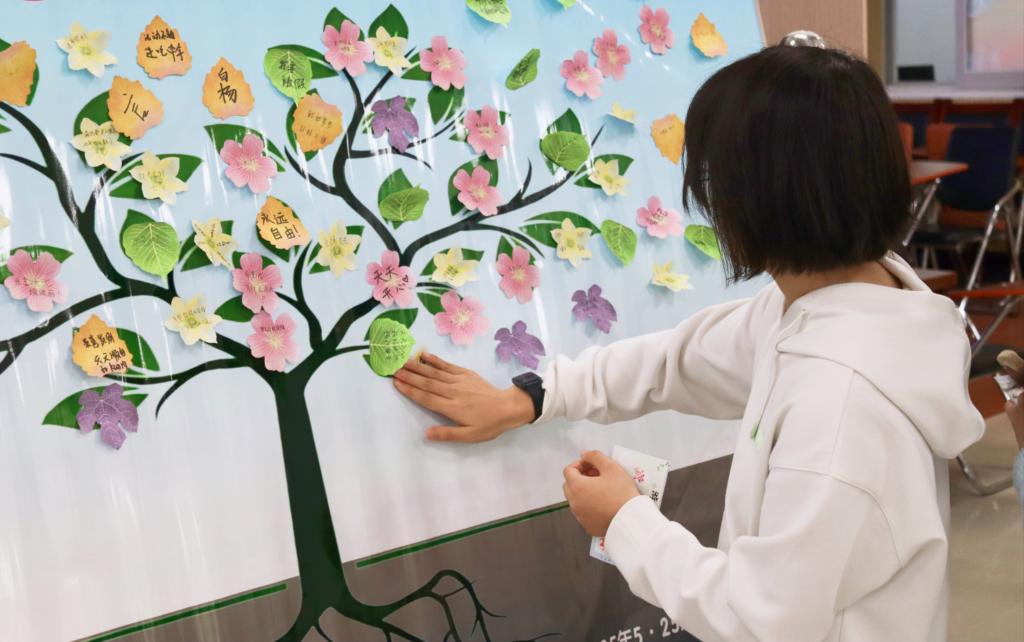 活动现场气氛热烈,心理委员认真组织和引导。学院所策划的两大心理游戏在众多游戏中的参与度均较高。在《根系传承·心灵拼途》中,几位同学齐心协力共同完成校史连线,对我校的建校历史有了进一步的了解,心灵树洞环节中,同学们挑选心仪的树苗卡片,写下困扰或目标,贴于“根系区”和“树冠区”,正确认识自我,“粉碎”负面情绪。在《桃李同心·协作迷宫》中,两人一组,一人蒙眼扮演“桃李幼苗”,另一人担任“引导者”,共同躲避“风雨障碍”,同学们通过穿越迷宫,体验团队协作的重要性。为确保活动顺利进行,组织者采取了多项保障措施,包括安全防护、人员配置、物资管理和分流机制。