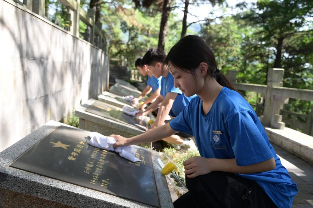 队员细心擦拭墓碑浮尘(摄影:冯争峰)