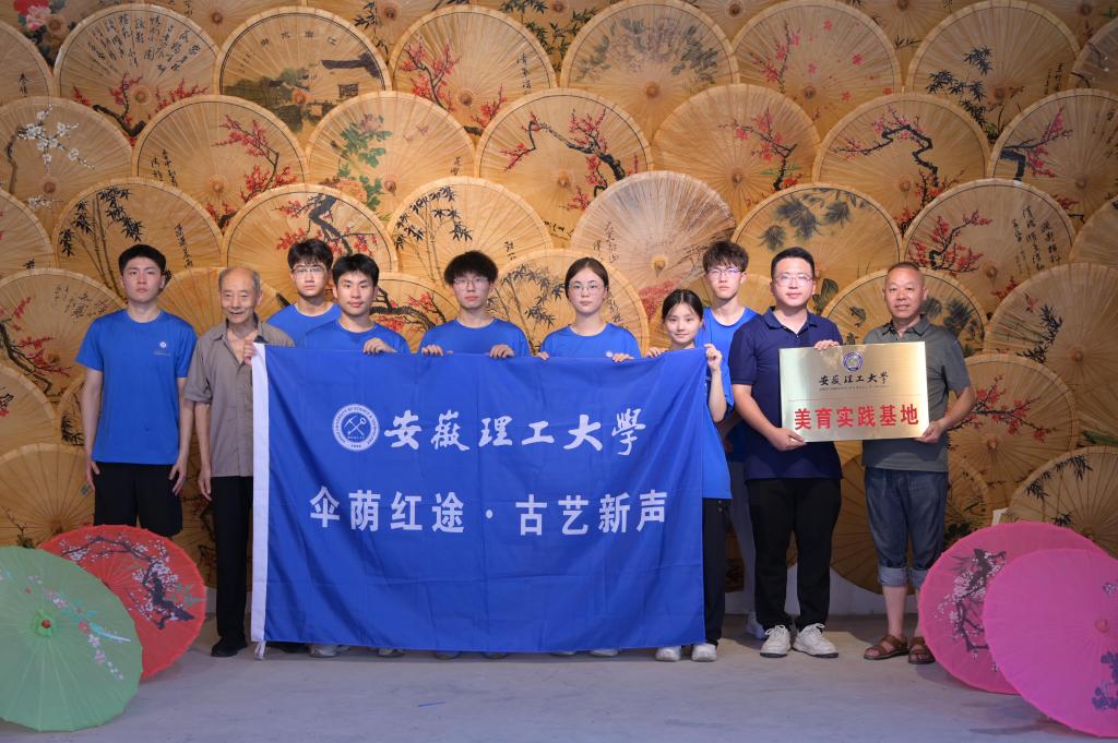 “伞荫红途,古艺新声”团队来到位于昌桥乡的孤峰村,沉浸式制作被誉为“中国民间伞艺活化石”的油纸伞。在泾县国民油布伞厂,一位八旬老匠人手持毛竹,现场展示削条、钻孔到组装制作技艺,动作娴熟流畅。他质朴地说:“过去制伞养家,如今守艺传灯,总得有人扛着走。”在伞面制作工序期间,老匠人手持剪刀,边操作边讲解:“裁布差不得分毫,稍有偏差,伞撑开后就会歪斜变形。”转眼间,伞面雏形拼接完成,毫厘之间尽显精准。队员们接力体验剖竹、打磨、桐油涂刷、晾晒,粗糙竹材在“一笔一划”的慢工细作中渐渐成型,也让队员们深刻领悟到匠心精神的内涵。非遗体验之旅接近尾声时,团队与泾县国民油布伞举行“美育实践基地”授牌仪式。