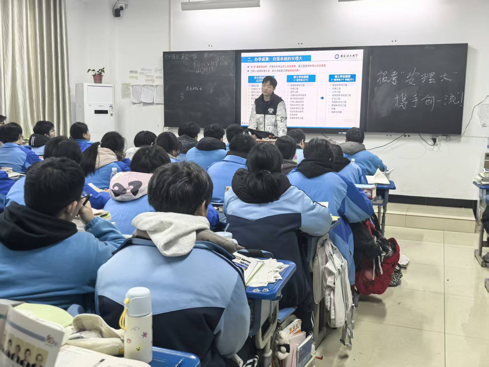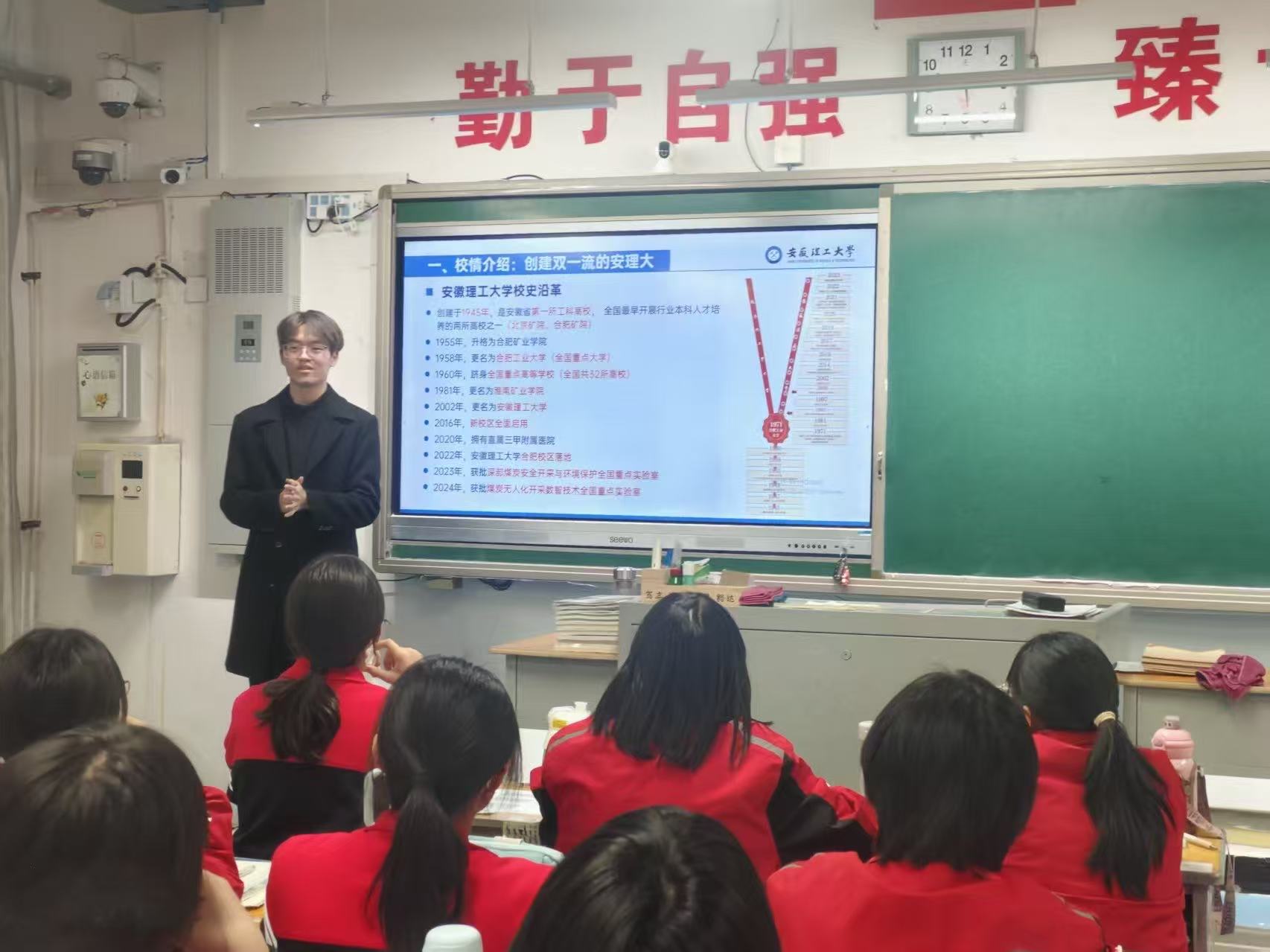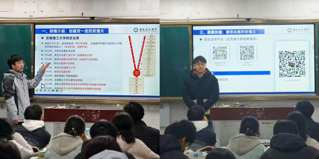 2024级新能源汽车工程专业的黄浩和裘旭同学,既是高中同窗,又相聚安理,同期拿到2024-2025学年国家励志奖学金。2月1日,两名学生一同走进安徽省凤阳中学,用“学长学姐说”的轻松方式,分享安理的学科实力、专业特色和校园生活,通过互动问答点燃现场气氛。这场宣讲不仅为学弟学妹们点亮了大学梦想,也让安理的声音传递到更多年轻学子心中,充分展现了优秀学子饮水思源、反哺母校的责任与担当。