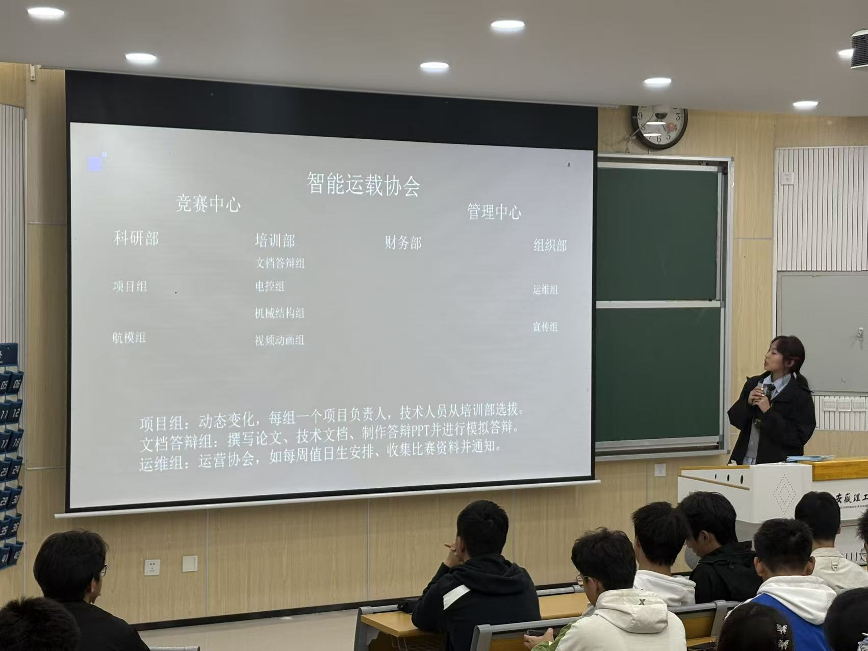 社团骨干吕佳璐同学介绍了智能运载协会的组织架构和社团骨干的人事安排。同时,介绍了社团三位经验丰富的指导教师。重点汇报了过去一年社团组织的活动和参加学科竞赛的成果以及社团配备的软硬件设备。