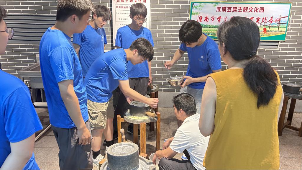 随后,队员们奔赴寿县豆腐主题文化园,在缕缕豆香中,同学们亲手体验千年豆腐制作工艺,感悟“一箪食”背后蕴藏的劳动智慧与非遗韧性。接着,成员们移步二十四节气馆,感受现代光影技术生动演绎古老农耕文明的天时智慧和传统节气知识在沉浸式体验中焕发时代新意。